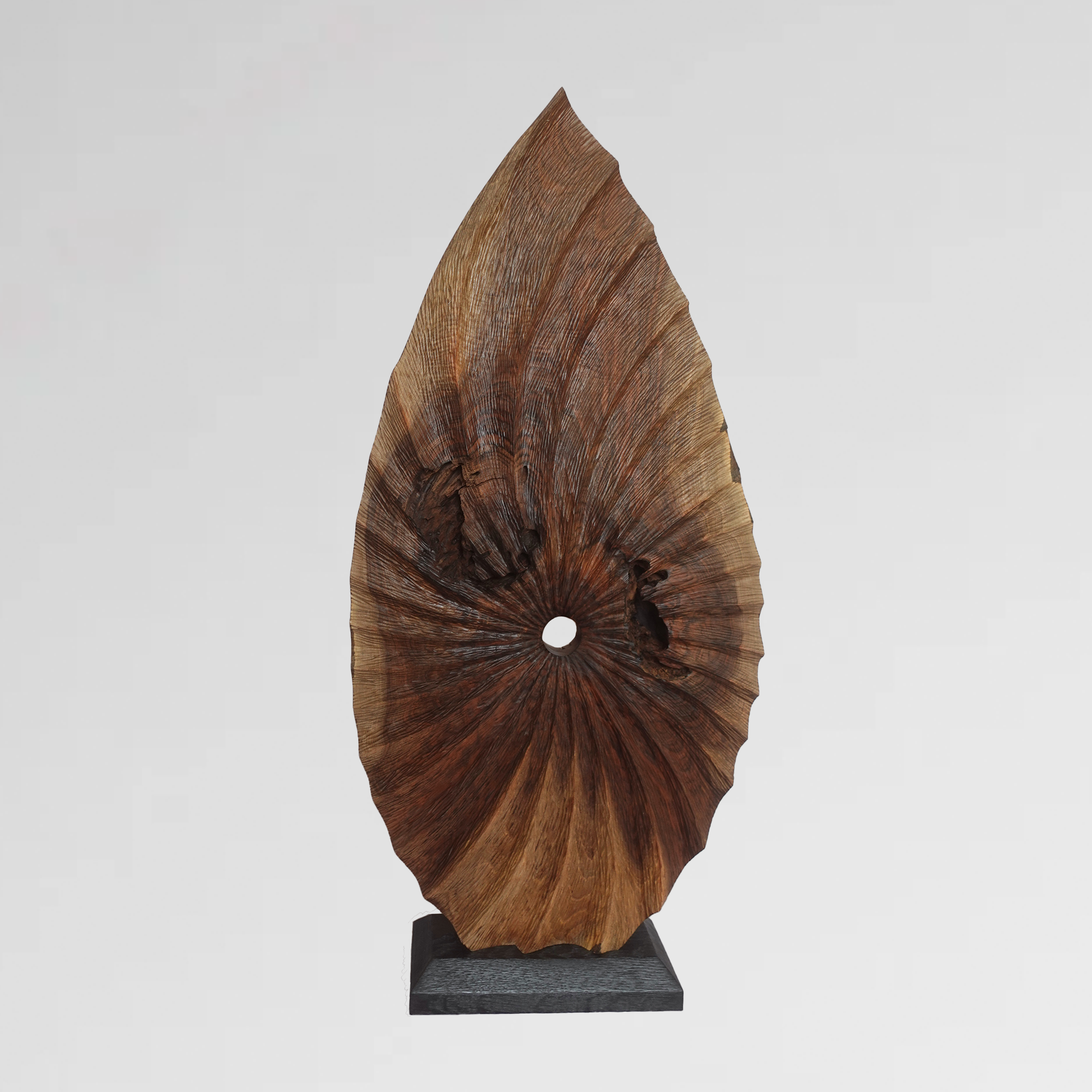 Becoming is a sculptural piece that beautifully marries olive ash and walnut, carved into the elegant shape of a leaf. The natural cracks that grace both sides of the wood add character and depth, telling a story of growth and transformation. From the center of the leaf, a delicate pattern emerges, radiating outward toward the edges, symbolizing the organic process of change and the journey from within to the outer world. The contrast between the light olive ash and the darker walnut enhances the piece's visual texture, making Becoming a striking representation of nature’s resilience and the beauty of imperfection.